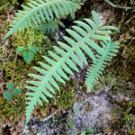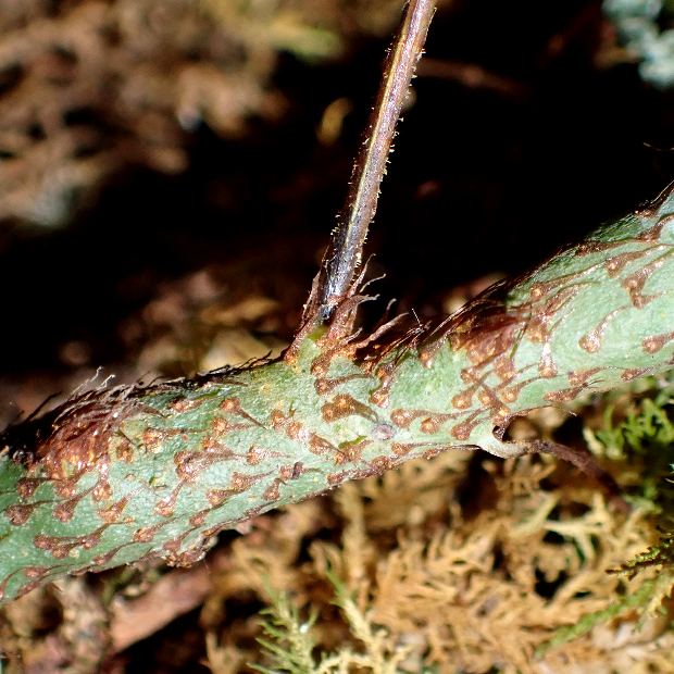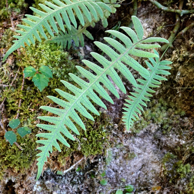 暖かい地域に多いシダで、 つる植物のように岩や幹をよじ登ります。 葉は青白っぽさがあってU字に深く切れ込み、 全体短毛がびっしりでフサフサします。 根茎は青緑色で目立ち、 青根の由来になっています。 夏に葉を枯らし、 秋に葉を出すサイクルをもちます。