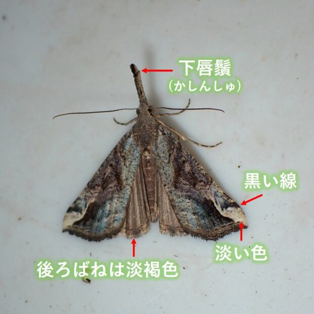 ヤガ科アツバ亜科の仲間。 長い下唇鬚(かしんしゅ)が特徴的。 これをテングの鼻に見立て名づけられました。 下唇鬚はパルピとも言い、 においを感じたり、 触角の補助の役割があると言われています。