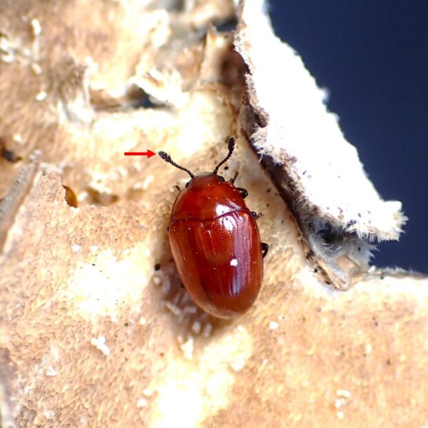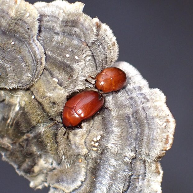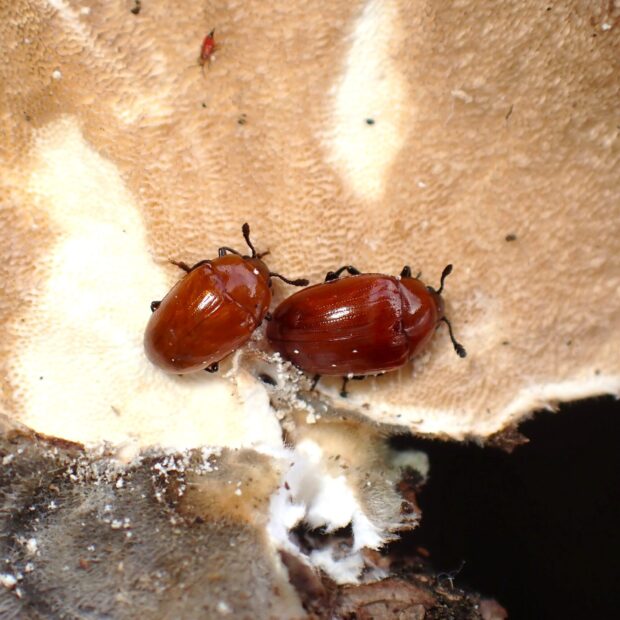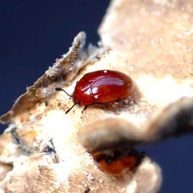 オオキノコムシ科の仲間。 つやのある赤い体の小さなキノコムシ。 朽木や枯木に生えるカワラタケなどのキノコに集まります。