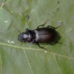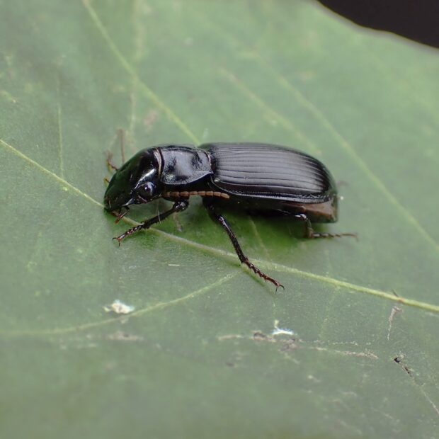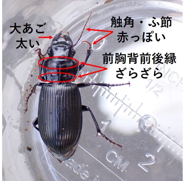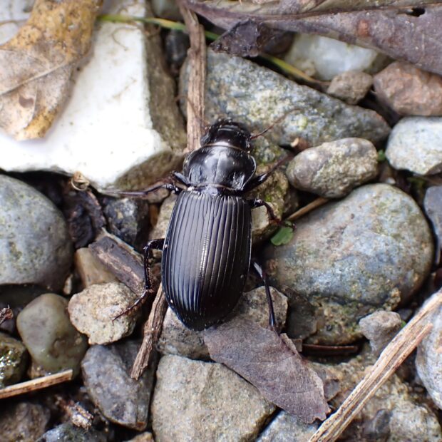 オサムシ科の仲間。 大きなゴミムシ。 全身黒色で、 オスの体は光沢があり、 メスは光沢がありません。 歩き回って小動物を食べる他、 植物のタネも食べます。