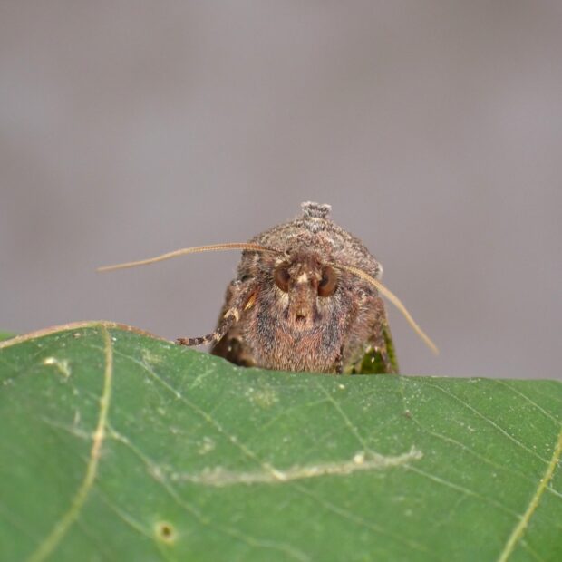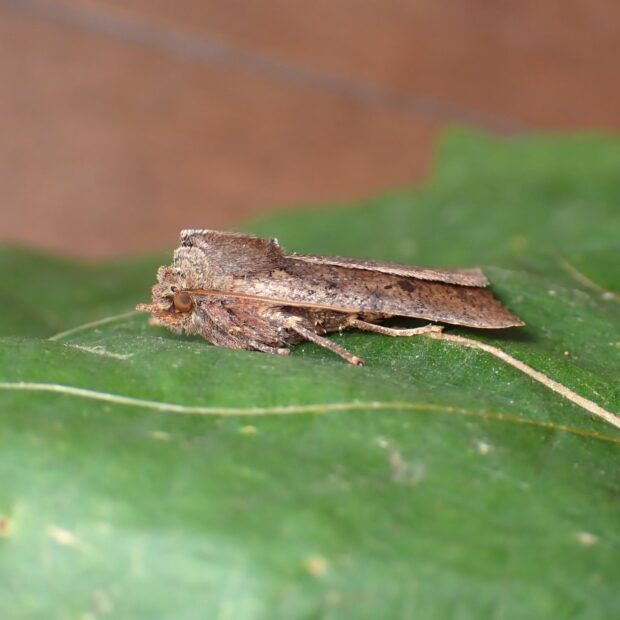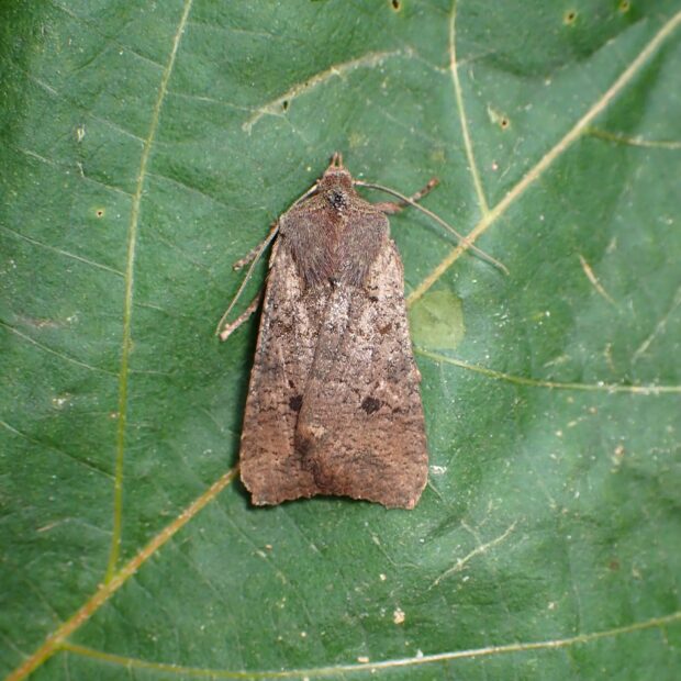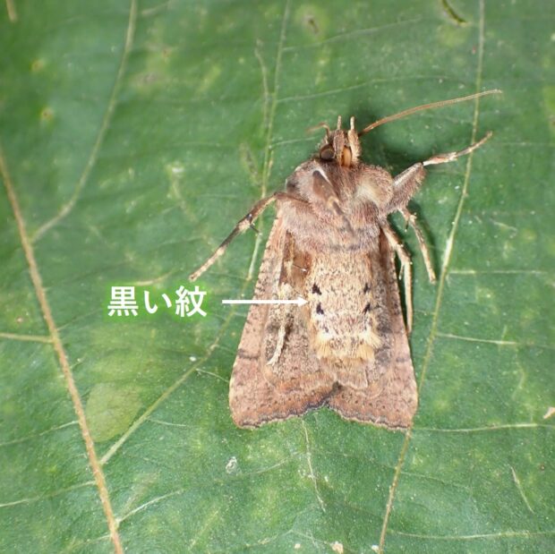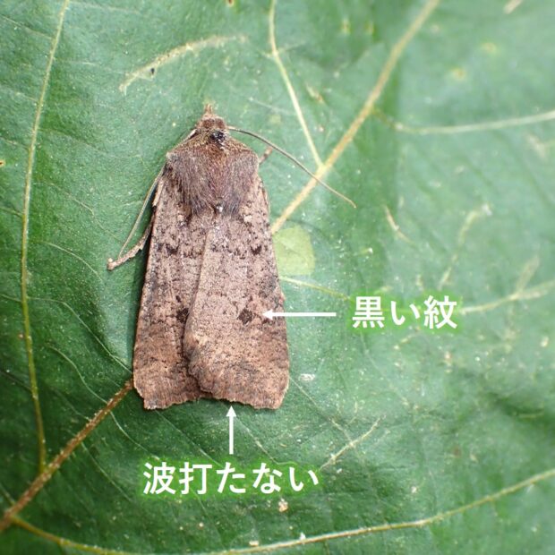 ヤガ科キリガ亜科の仲間。 個体変異が大きく、 黒いものや淡い色など色や模様はいろいろです。 11月頃羽化し、 成虫で冬を越します。