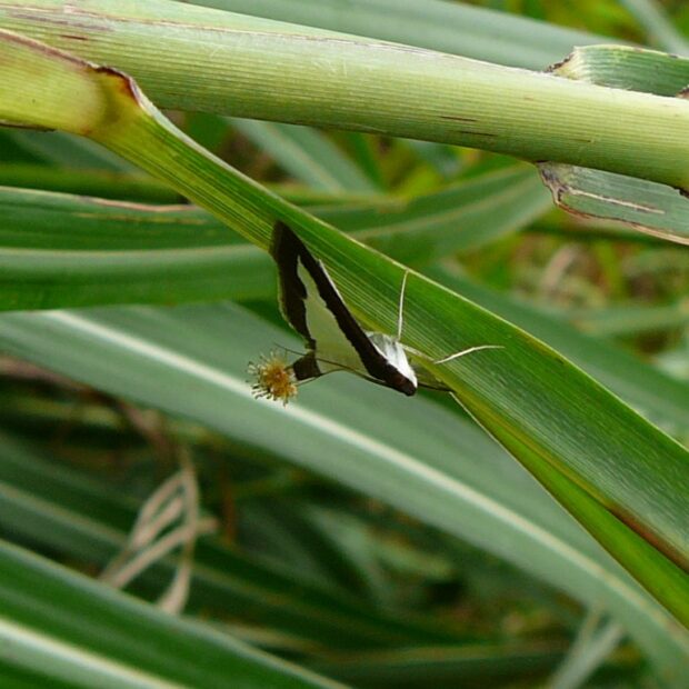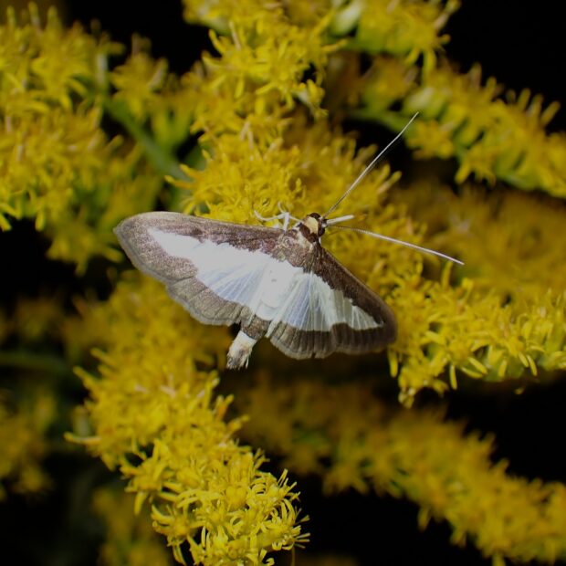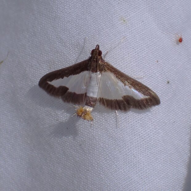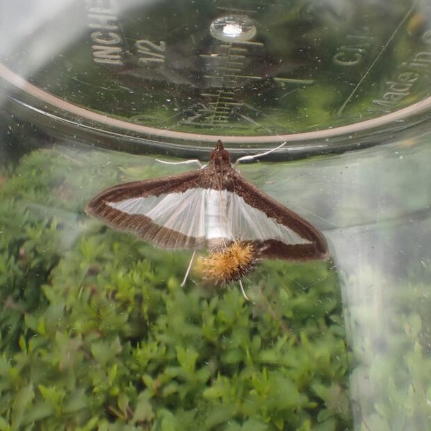 ツトガ科ノメイガ亜科の仲間。 ウリ類を食べることから、 別名ウリノメイガと呼ばれます。 オスもメスもお尻に毛の束があり、 グルグル回してフェロモンを出します。