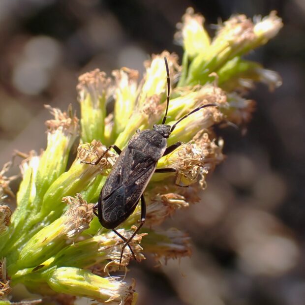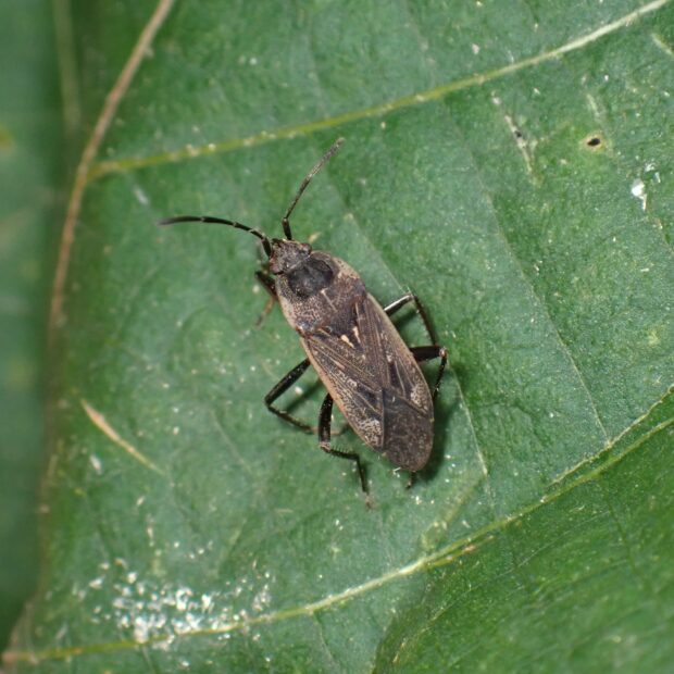 ヒョウタンナガカメムシ科の仲間。 草はらで見られます。 前ばねは黒褐色で、 ふちは淡い色をしています。 皮質部の先端近くに明瞭な白色の紋はありません(似ているアムールシロヘリナガカメムシは明瞭な白紋がある)。