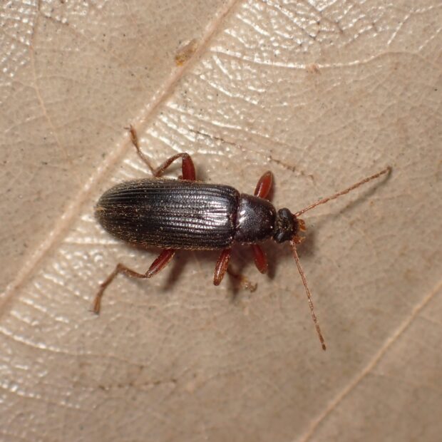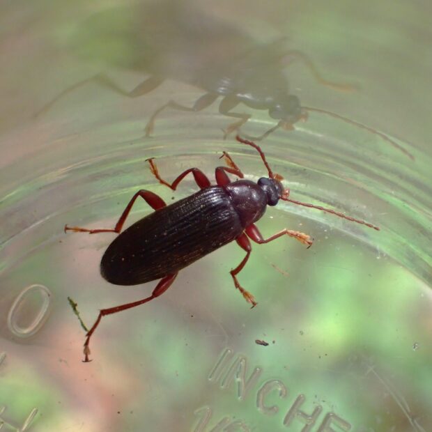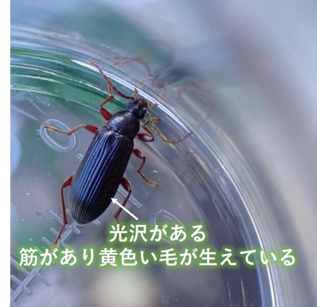 朽ち木にすむ光沢のあるクチキムシ