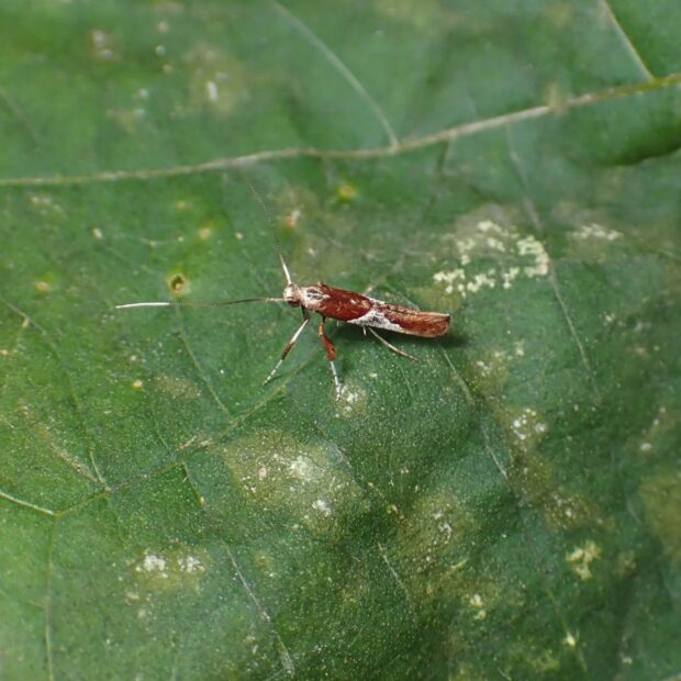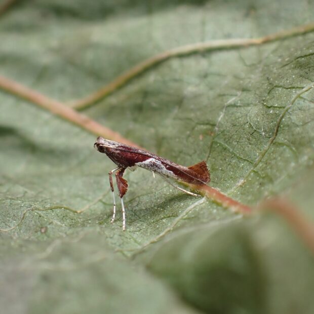 ホソガ科の仲間。 こげ茶色の細い前ばねに白っぽい三角の紋があります。 幼虫はエノキの葉先を巻いて住みかを作り、 内部の葉を食べます。