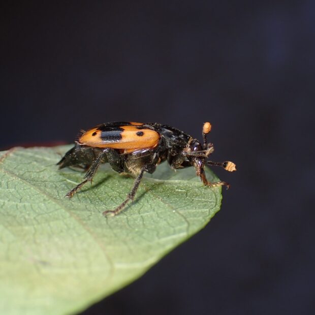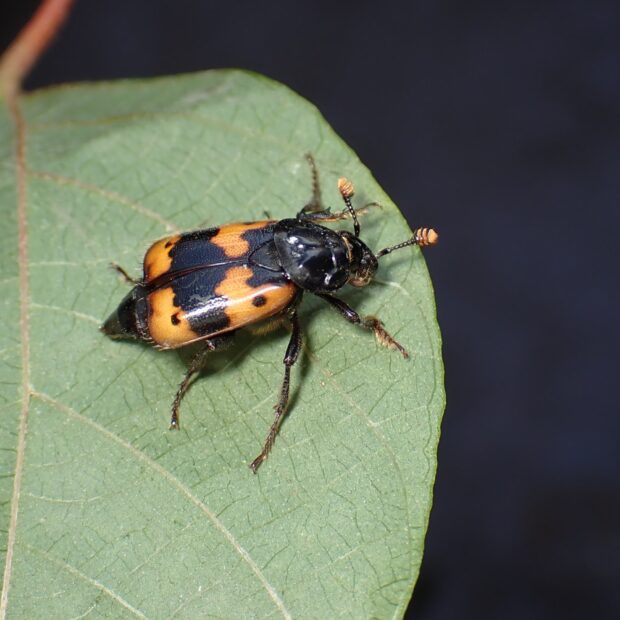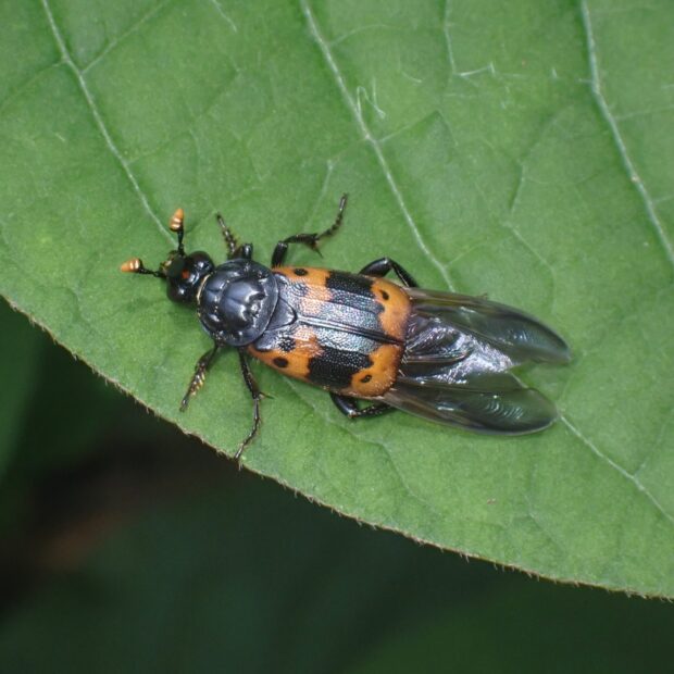 シデムシ科モンシデムシの仲間。 黒い体に4つのオレンジ色の紋があり、 その紋の中に黒点があります。 動物の死骸に集まります。