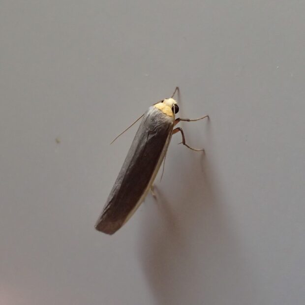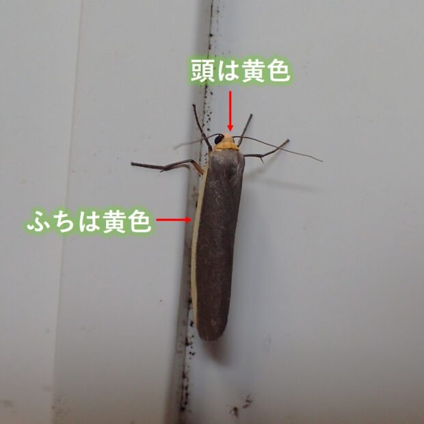 ヒトリガ科コケガの仲間。 前ばねはグレーで前縁が黄色。 頭部が黄色であることが特徴。 体型はほっそりしており、 はねを立てて止まります。