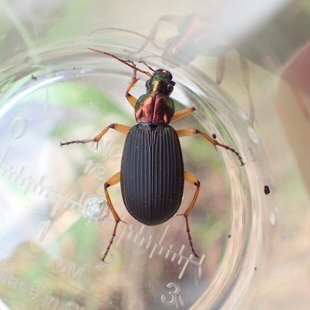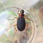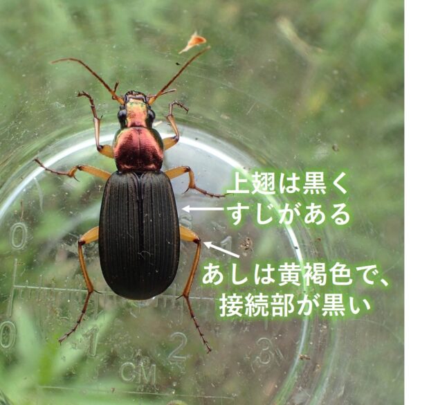 オサムシ科アオゴミムシの仲間。 大型。 頭と胸は金属光沢のある赤銅~緑色、 上翅(じょうし)はつやのない黒色で縦すじが目立ちます。 草地などで普通に見られます。 昼間は石の下などに隠れており、 夜になると、 エサを求めて歩き回ります。