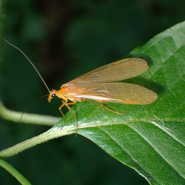 シリアゲモドキ科の仲間。 山の渓流沿いや林縁の湿った場所で見られます。 オスは黄褐色の半透明のはねを持ち、 紋はありません。 メスは3つの型があり、 はねに紋がないもの、 はねの先端に紋があるもの、 はね全体に紋があるものが知られています。