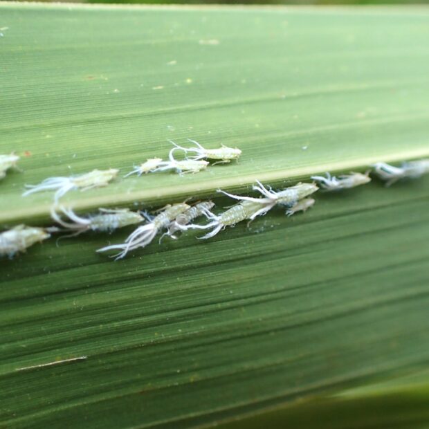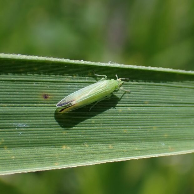 ウンカ科の仲間。 マコモの葉につく淡い緑色のウンカ。 はねは透明で、 オスははねの端が黒く、 メスは黒くなりません。 幼虫は尾端に白いひものようなロウ物質をつけています。