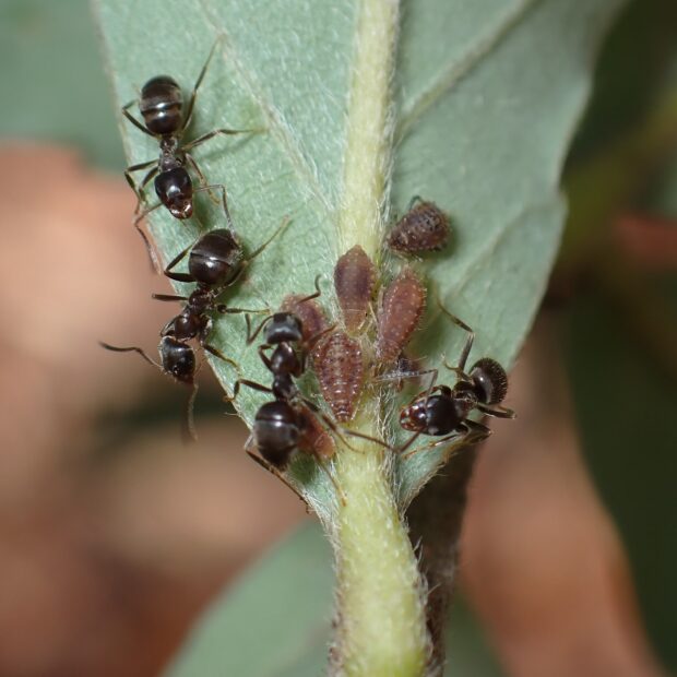 • 甘露を求めてアリがやって来る。