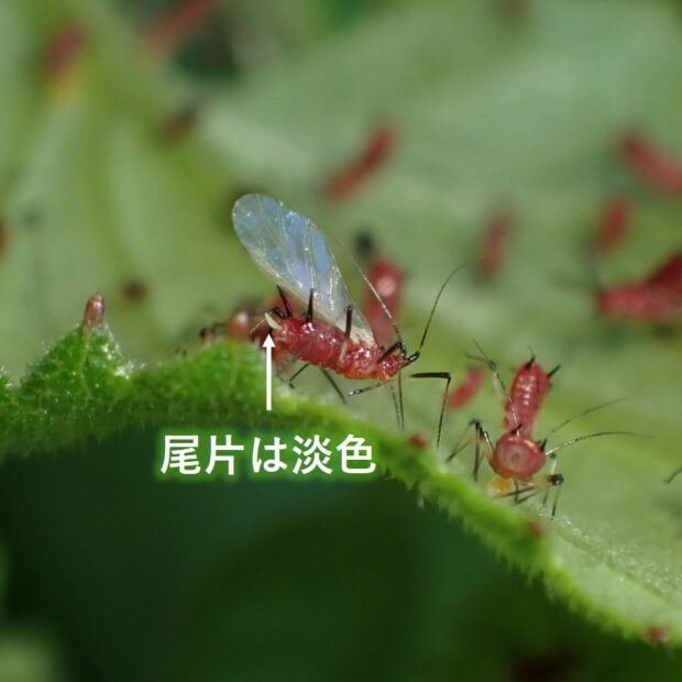 ヒゲナガアブラムシの仲間。 シラヤマギクで周年生活。 体は光沢がある赤色~暗褐色、 角状管は黒く、 尾片は淡色か体と同色です。
