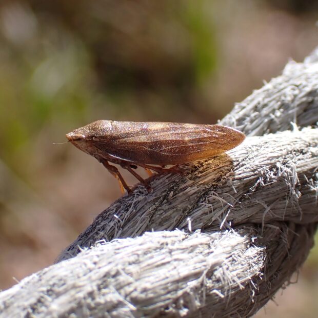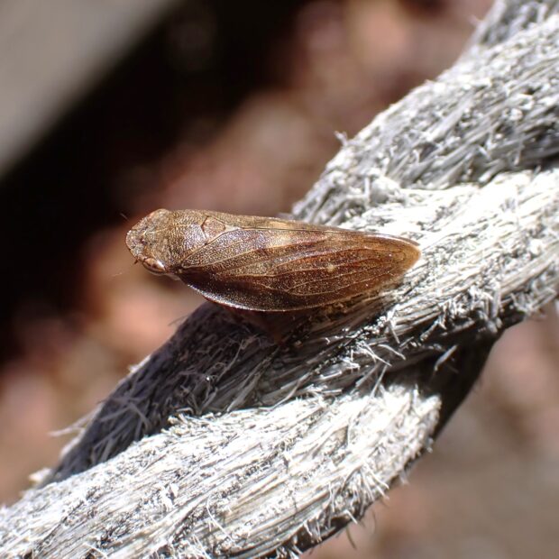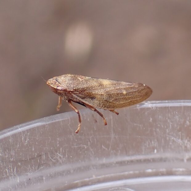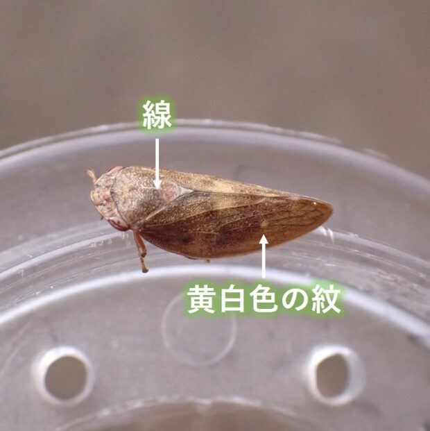 アワフキムシ科の仲間。 前ばね端より1/3のところに黄白色の紋があるのが特徴。 カキやヤナギなどにつきます。