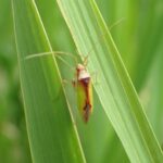 カスミカメ科の仲間。 前ばねに赤褐色の紋があるカスミカメムシ。 長い触角が特徴的。 マメ科やイネ科植物で見られます。