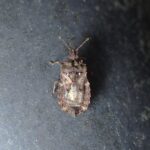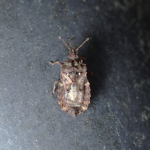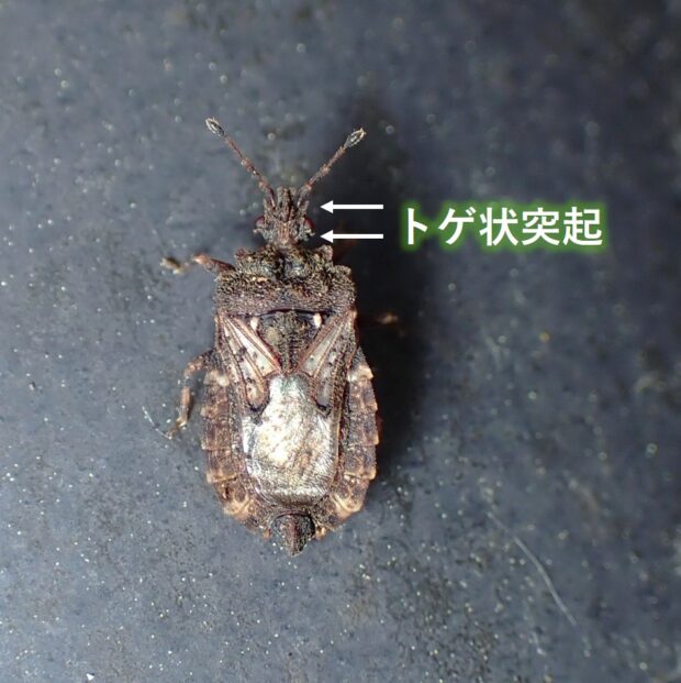ヒラタカメムシ科の仲間。 シワタケなどが生える倒木で見られます。 体は平たく、 触角基部と複眼後方にトゲ状突起があるのが特徴。 前胸背には1対の円すい状突起があります。