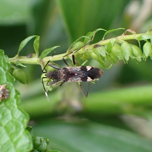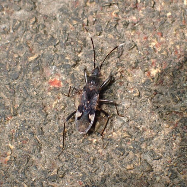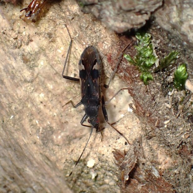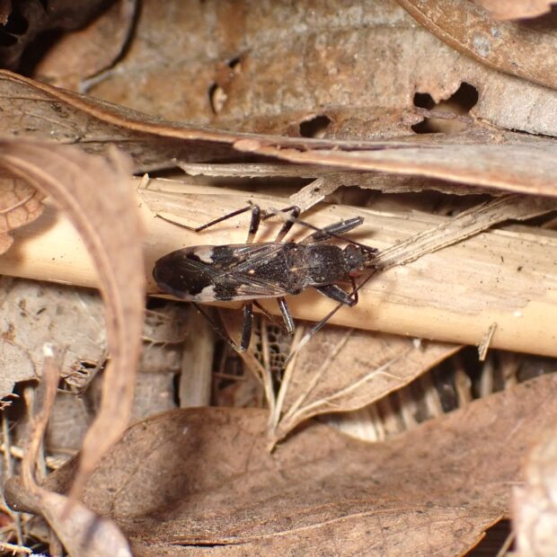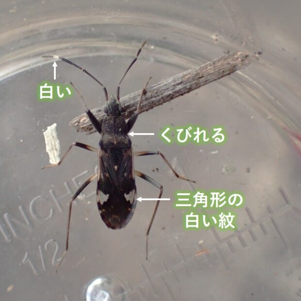 ヒョウタンナガカメムシ科の仲間。 体は黒くほっそりしており、 前ばねにある白い三角の紋が目立ちます。 林や草地などの地表で、 普通に見られます。