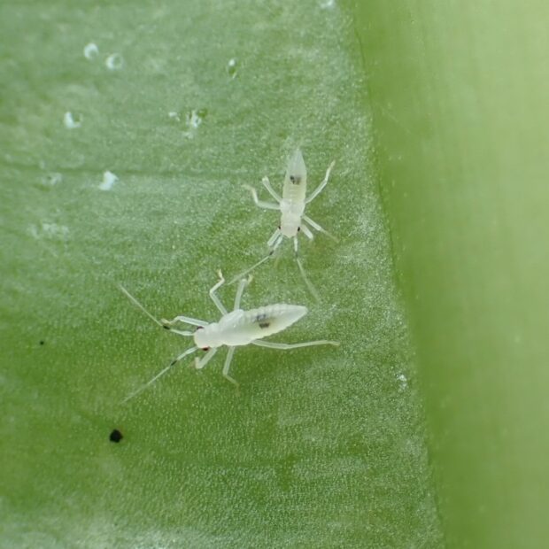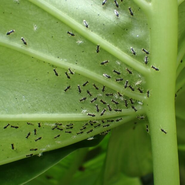 カスミカメムシ科の仲間。 クワズイモの葉裏で、 成虫と幼虫が集団でコロニーをつくり生活しています。 クワズイモカスミカメがいると、 葉の表が白っぽくなります。