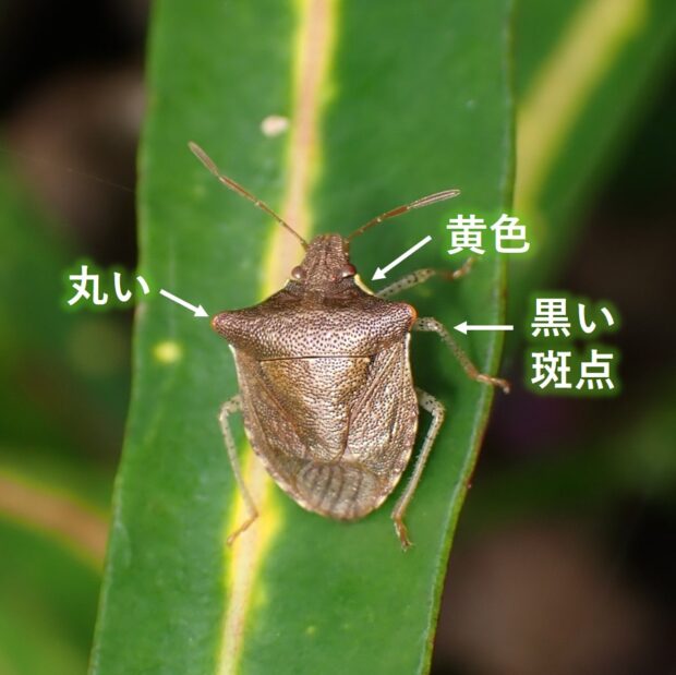 南西諸島で見られる褐色のカメムシ。 前胸背側角は突出していますが尖っておらず、 先端が丸いです。 胸の前側のふちは黄色。 トゲカメムシより小型です。