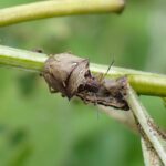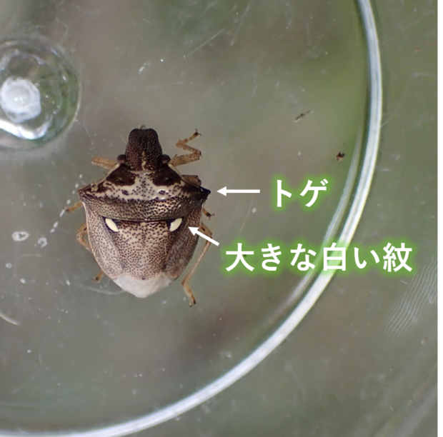 イネ科植物が生える草地や田んぼで見られるカメムシ。 前胸背の側角はトゲ状で、 小楯板に大きな白い紋が1対あります。 山や寒い地域では類似種のオオトゲシラホシカメムシが見られます。