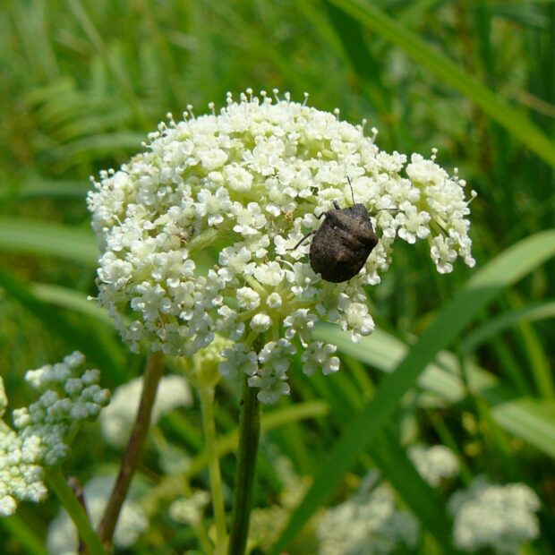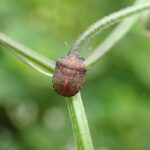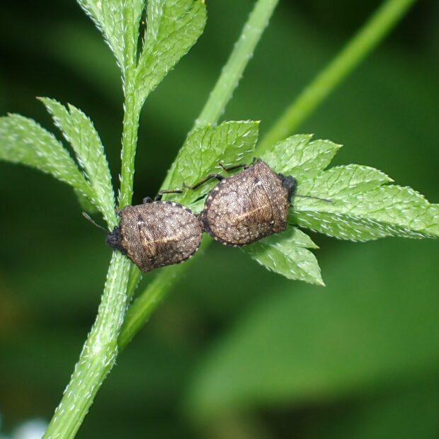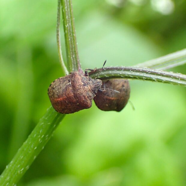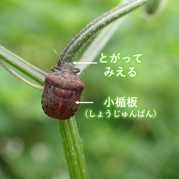 セリ科植物に群生する小さなカメムシ。 体は黄褐色で光沢はなく、 ゴツゴツしています。 頭部が突き出ていることから「ハナダカ」と名づけられました。