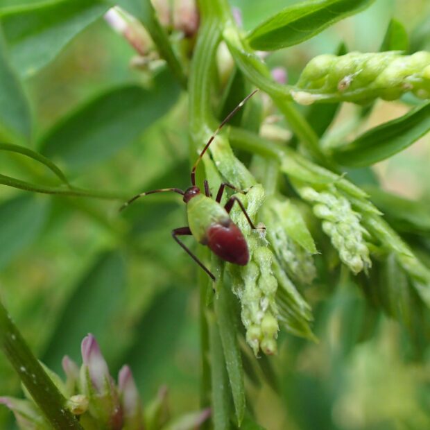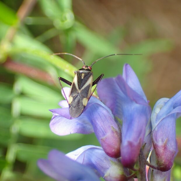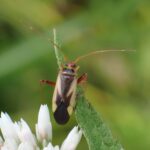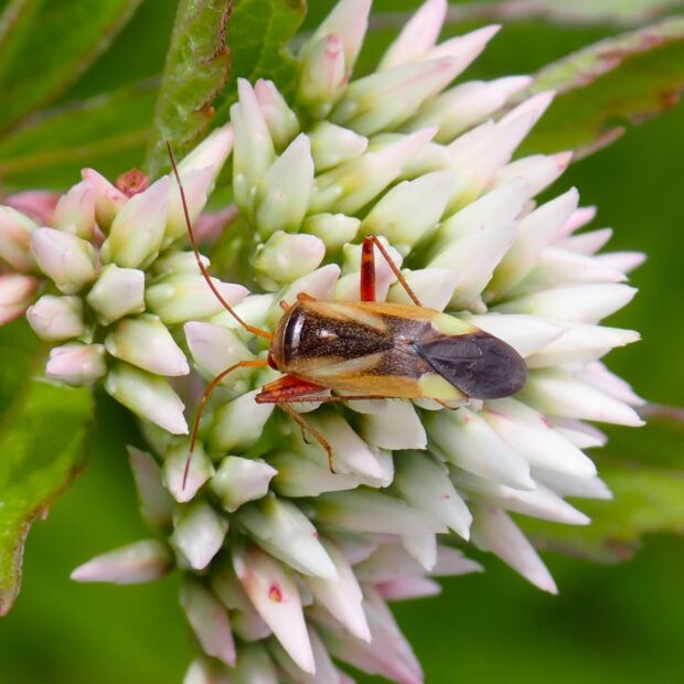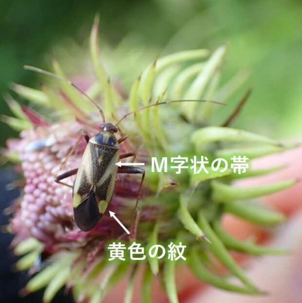 山の花にM字模様のカスミカメ