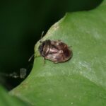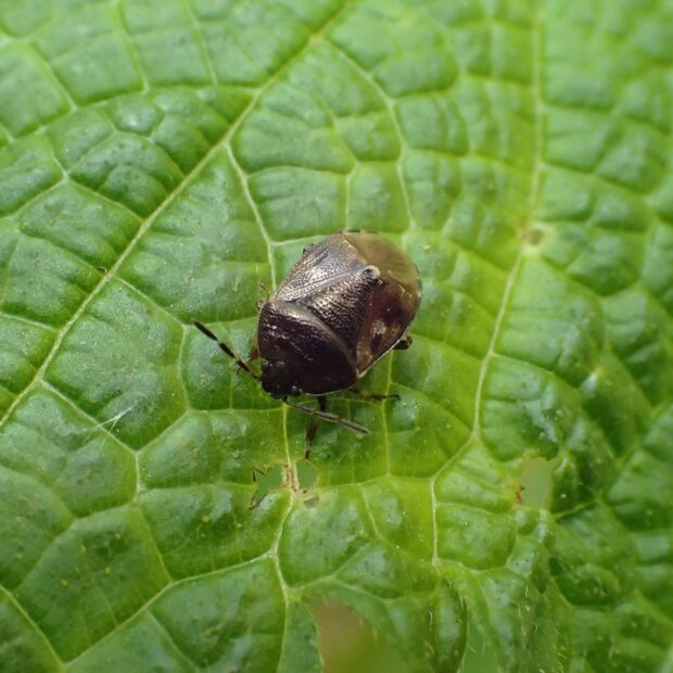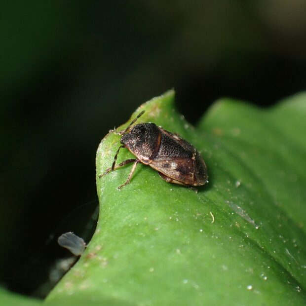 ツチカメムシ科の仲間。 体は黒色で、 はねにまだら模様がある小さなカメムシ。 モンツチカメムシの仲間は、 子育てをすることが知られており、 お母さんカメムシは、 地表に巣をつくり卵を産み、 巣の中の幼虫にハルニレのタネを運びます。