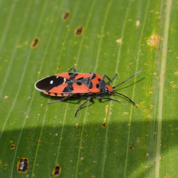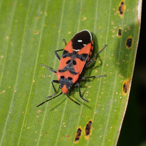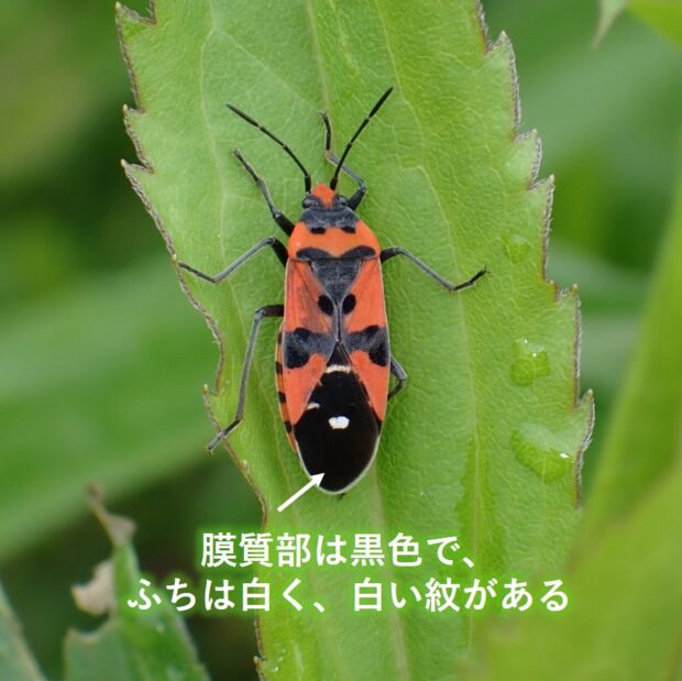 ナガカメムシ科の仲間。 オレンジ色の体と前ばねに黒い紋が入り混じり、 鮮やかで美しいカメムシ。 北海道と本州北部で見られる北方系のカメムシです。