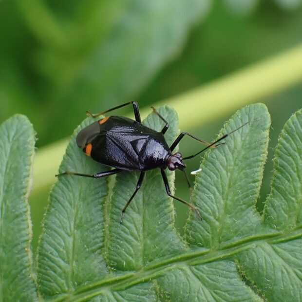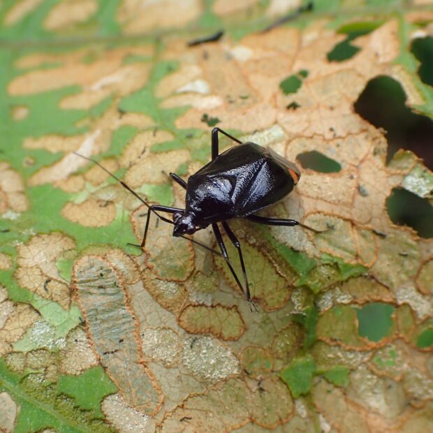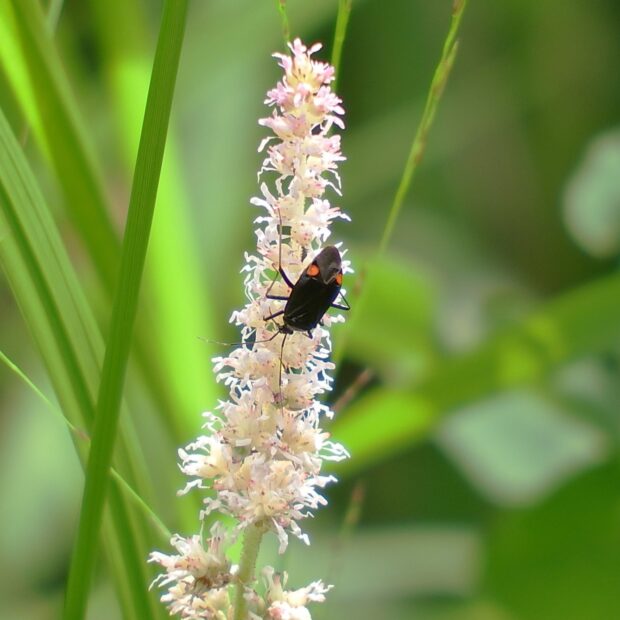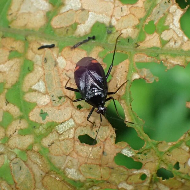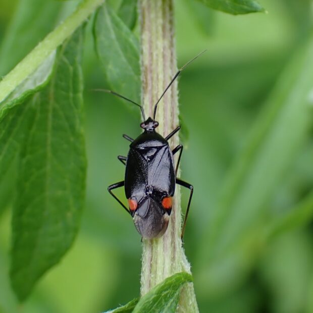 カスミカメムシ科の仲間。 光沢のある黒色の体に、 赤色の紋が目立ちます(赤色の紋がない黒化型がいる)。 山の草地で生活し、 花にやって来ます。
