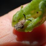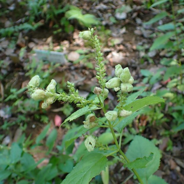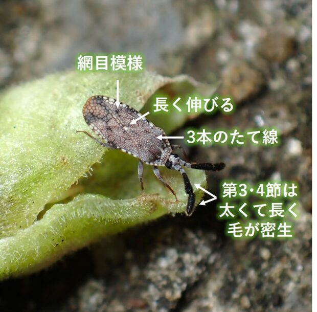 ニガクサなどに虫こぶをつくるグンバイムシ。 太い触角が特徴。 幼虫は虫こぶの中で育ち、 成虫はこの中で羽化し、 しばらく虫こぶの中で過ごしたあと外に出てきます。 虫こぶはニガクサツボミフクレフシと呼ばれます