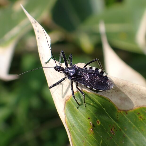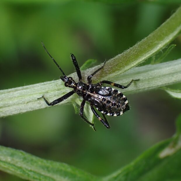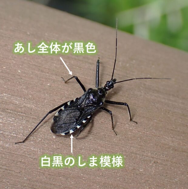 北方系のサシガメ。 体全体が黒色で、 腹部の横の結合板は白黒のしま模様。 触角とあしも黒色。 似ているシマサシガメはあしに白い部分があります。