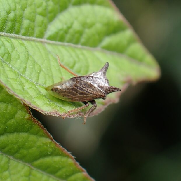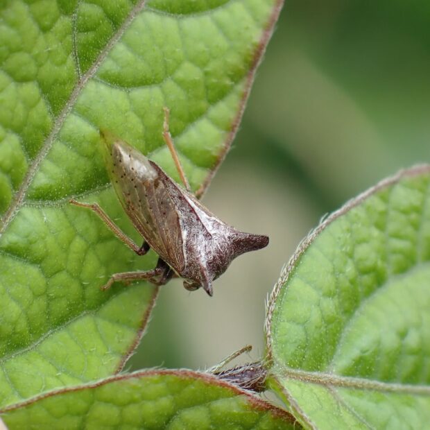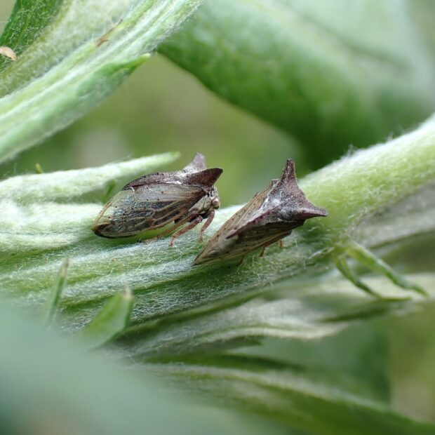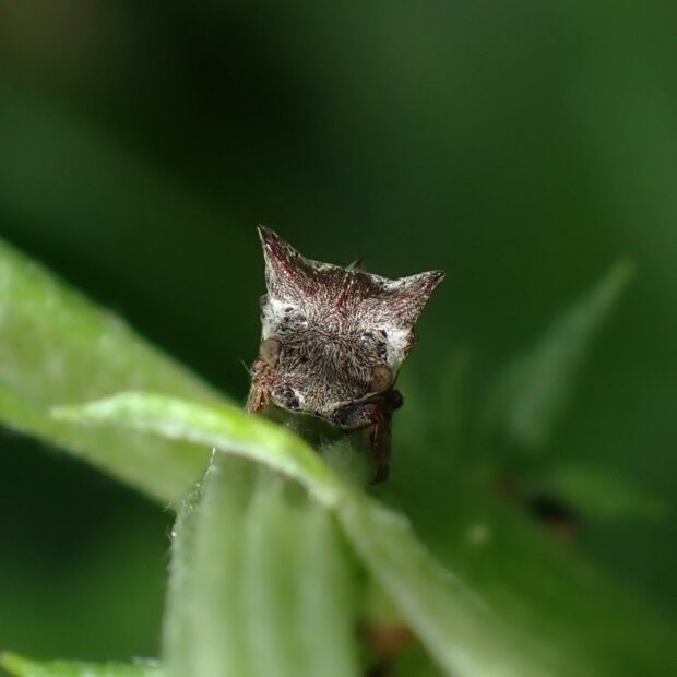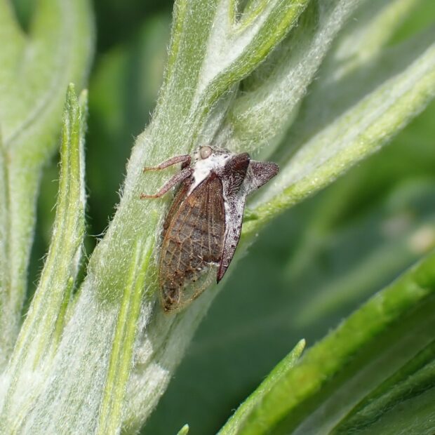 ツノゼミ科の仲間。 前胸背にある突起が目立ち、 耳のようにみえます。 黒褐色の体には白い毛が多く、 透明なはねをもちます。 寒冷地のヨモギなどで見られ、 近づくとピョンと跳ねて逃げます。