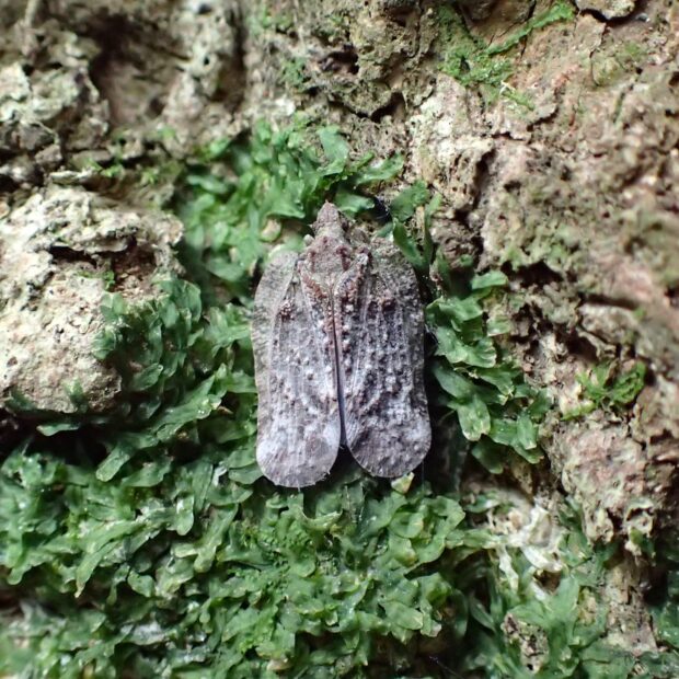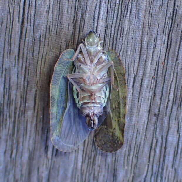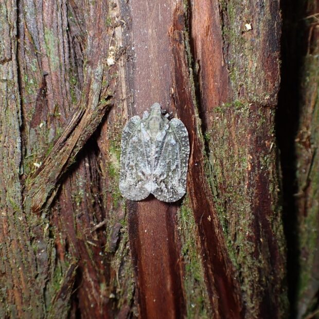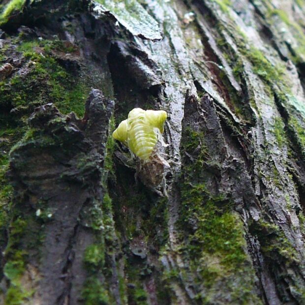 アオバハゴロモ科の仲間。 名前どおり、 体は色や質感も樹皮そっくりで、 幹に止まっていると見つけづらいです。 南西諸島で見られていた南方系の種ですが、 本州に生息域を拡大しているとのことです。