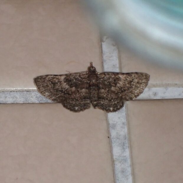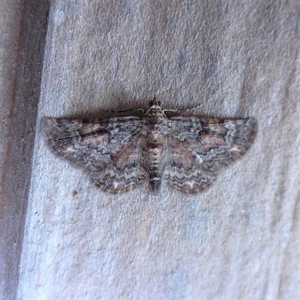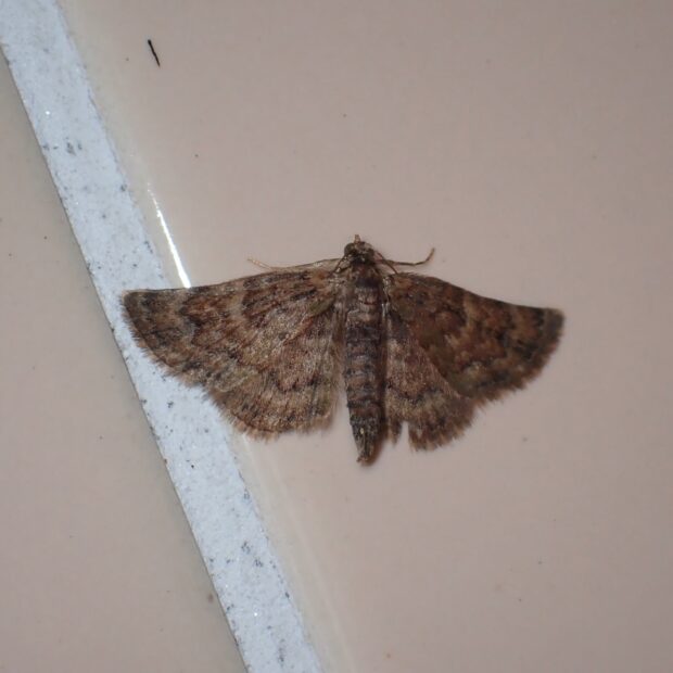 シャクガ科ナミシャクの仲間。 波型の線がある小さなガ。 色や模様はさまざまですが、 はねの形が特徴的。