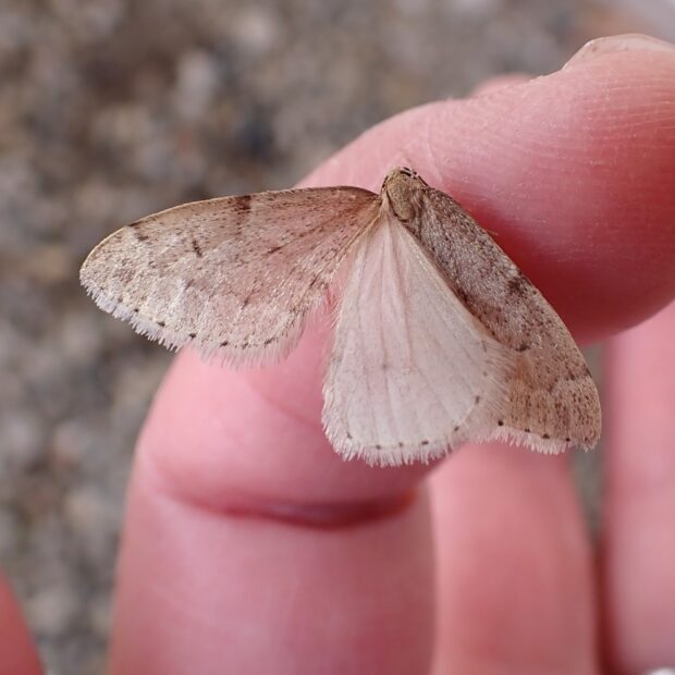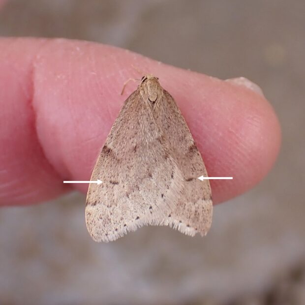 前ばねに小さな黒い点あるいは短い線があります。 メスははねがありません。 ウスバフユシャクやクロテンフユシャクに似ています。