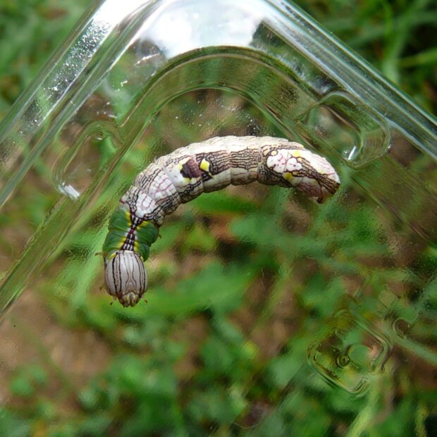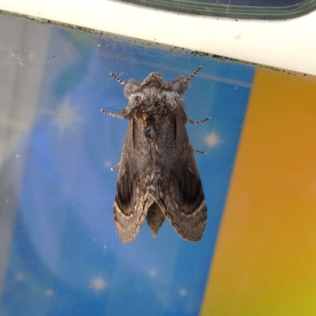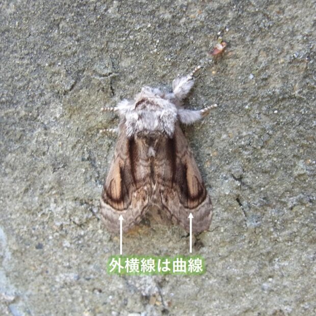 初夏~夏に見られるシャチホコガ科の仲間。 前ばねの中央に大きな暗褐色の紋がありますが、 個体差があります。 カーブを描いた外横線が特徴。 触角は、 オスは基部半分が両くし歯状、 メスは糸状。
