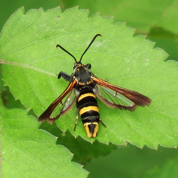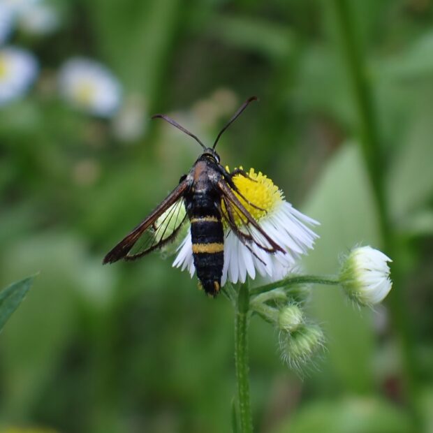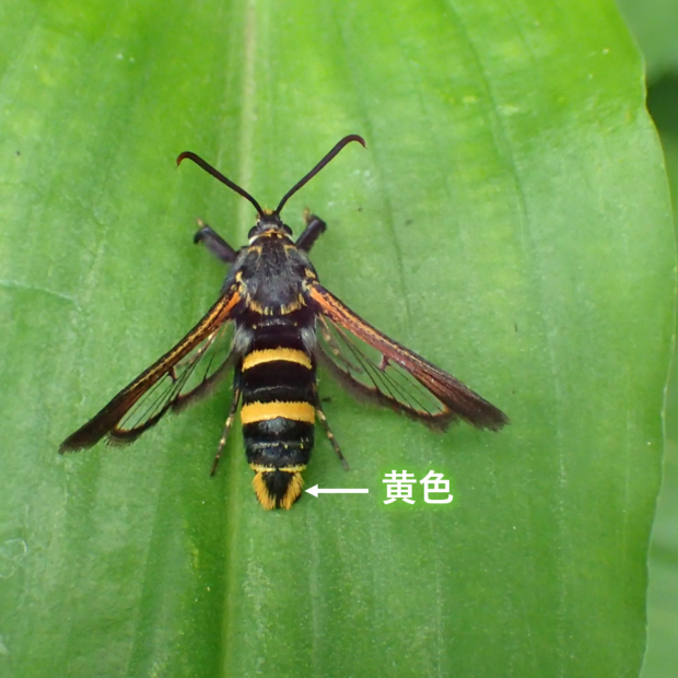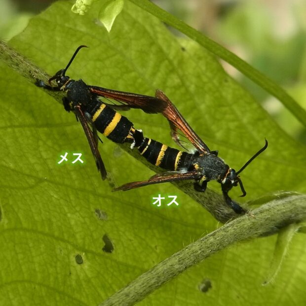 スカシバ科の仲間。 体は黒色で、 腹部に2本の黄色い帯がありハチのよう。 オオフタオビドロバチに擬態していると言われています。 幼虫は、 ヘクソカズラの茎に潜り、 虫こぶを作ります(ヘクソカズラツルフクレフシ)。 幼虫越冬。