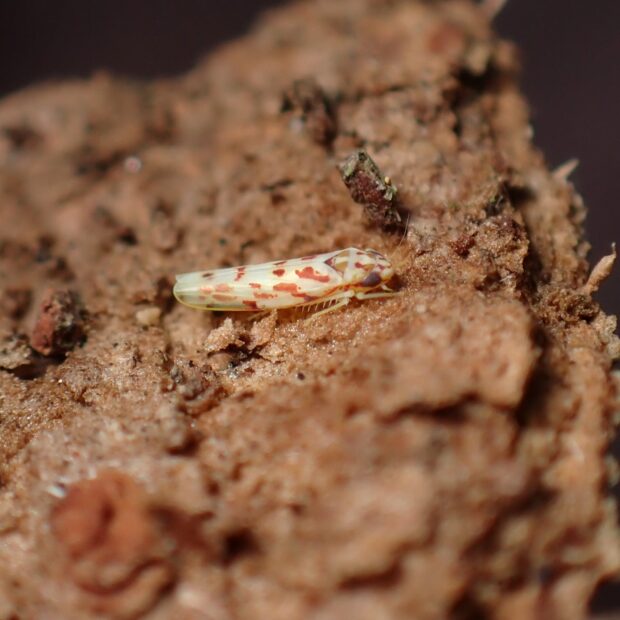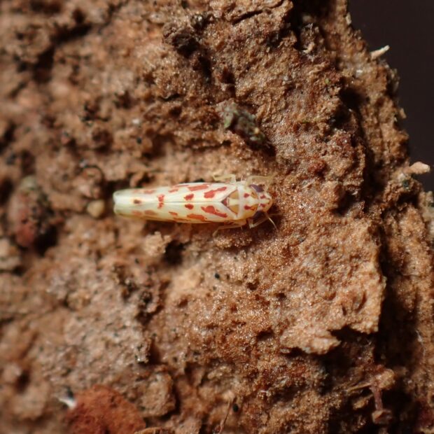 ヨコバイ科の仲間。 黄白色の体に赤い紋があるヒメヨコバイ。 赤い紋の形や大きさは個体差がありさまざまです。