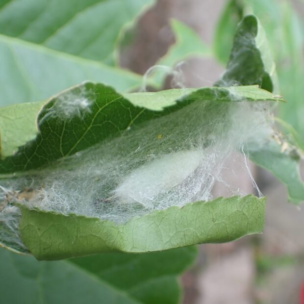 マユミに集団で巣を作るイモムシ