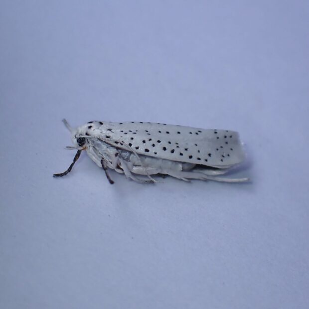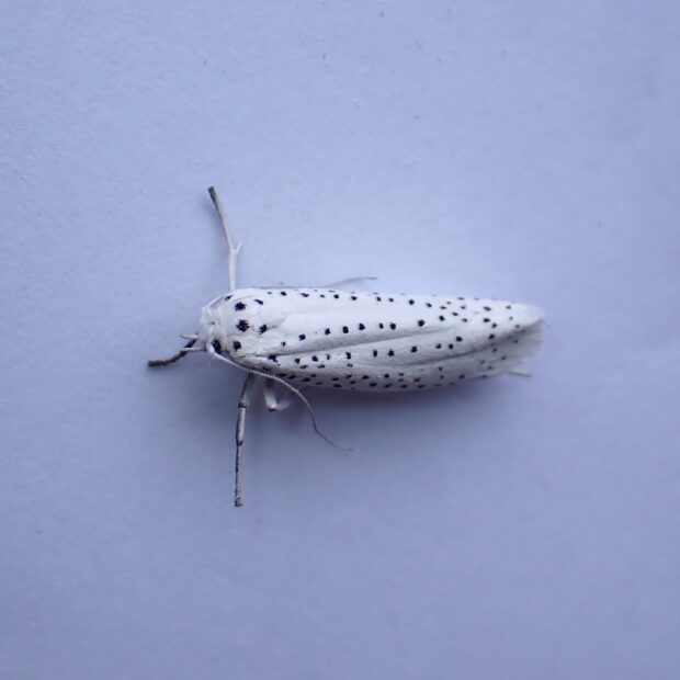 スガ科の仲間。 白いはねに黒い点が散らばる小さなガ。 「スガ」は「巣蛾」と書き、 幼虫が集団で糸を張り巣を作ります。 オオボシオオスガ、 マユミシロスガなど似ている種がおり識別は難しいです。