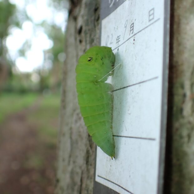 はねは黒っぽく、 青緑色のパステルカラーの帯がきれいな南方系のアゲハチョウ。 木や花のまわりを目まぐるしく飛びまわります。 都市部でも見られ、 公園や街路樹のクスノキにもやってきます。