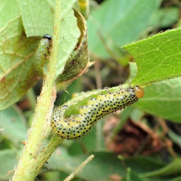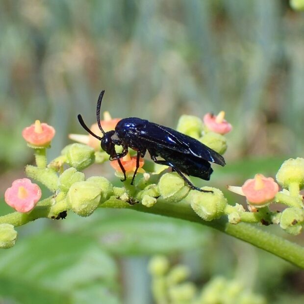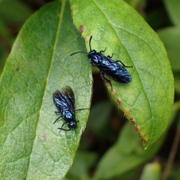 ツツジで見られる、 るり色の小さなハバチ。 メスは産卵管を葉のふちにさしこみ、 ツツジの葉の中に1個ずつ卵を産みます。 卵を産んだあとが、 茶色くなり目立ちます。 幼虫は葉を食べて育ちます。