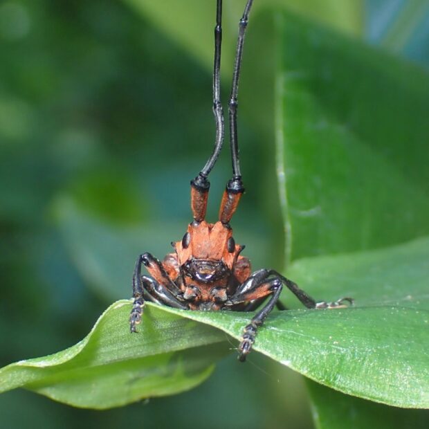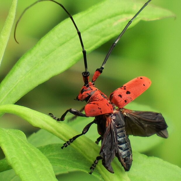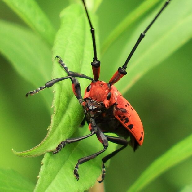温暖な地域で見られるカミキリムシ。 赤い体に黒い点々があり、 鮮やかな色で目立ちます。 触角とあしは黒色。 海に近いタブノキのある公園などで見られ、 ときに木を枯らすこともあります。 メスは、 タブノキの生木の樹皮に大きく楕円形に傷をつけ、 樹皮下に卵を産みます。