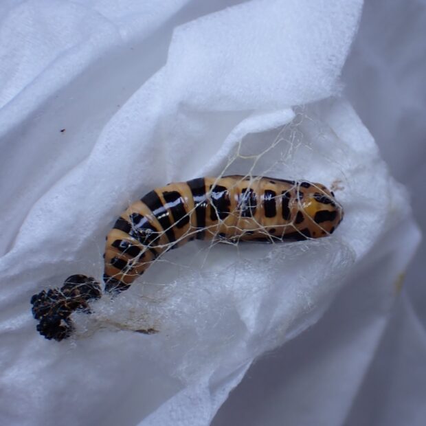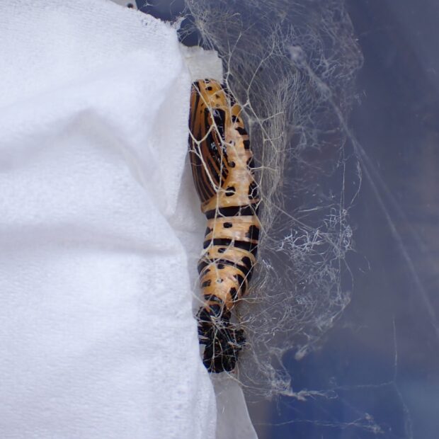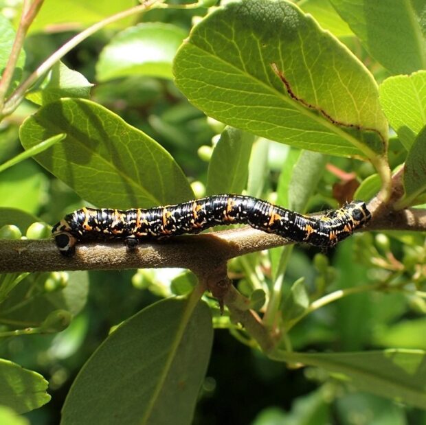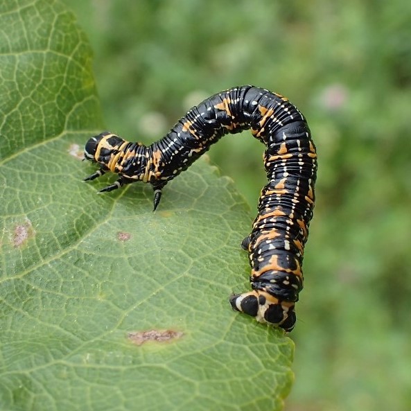 • 黒色にオレンジの模様、 頭に白い線がある幼虫。