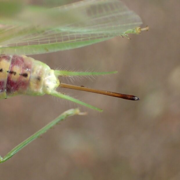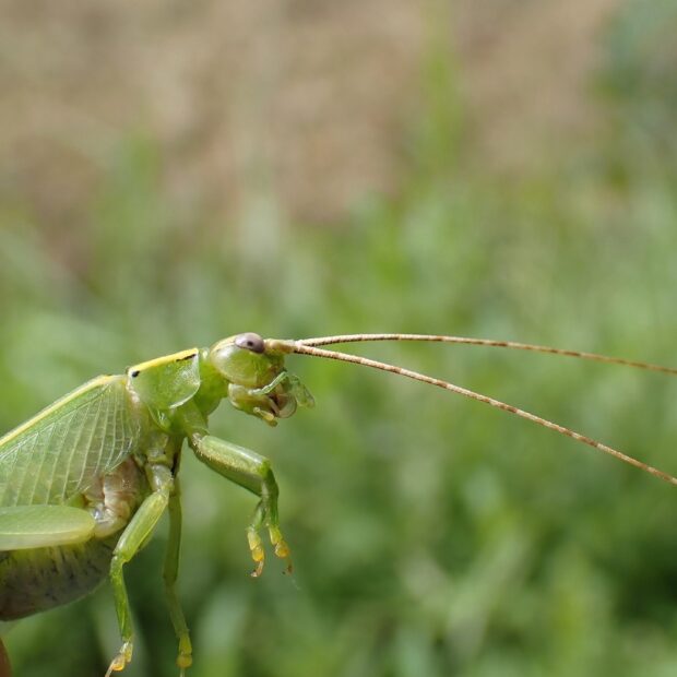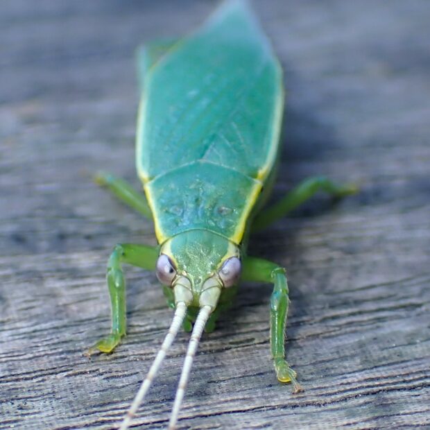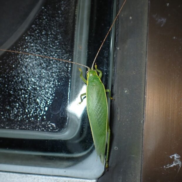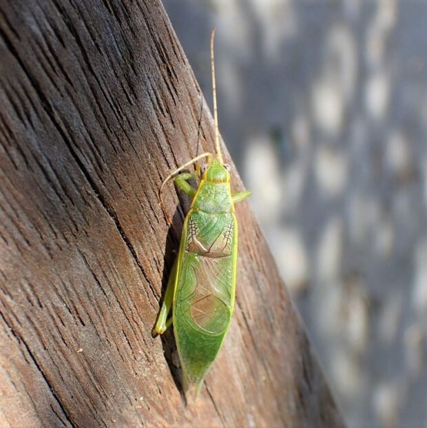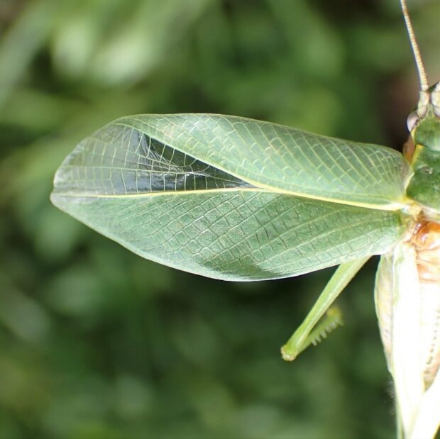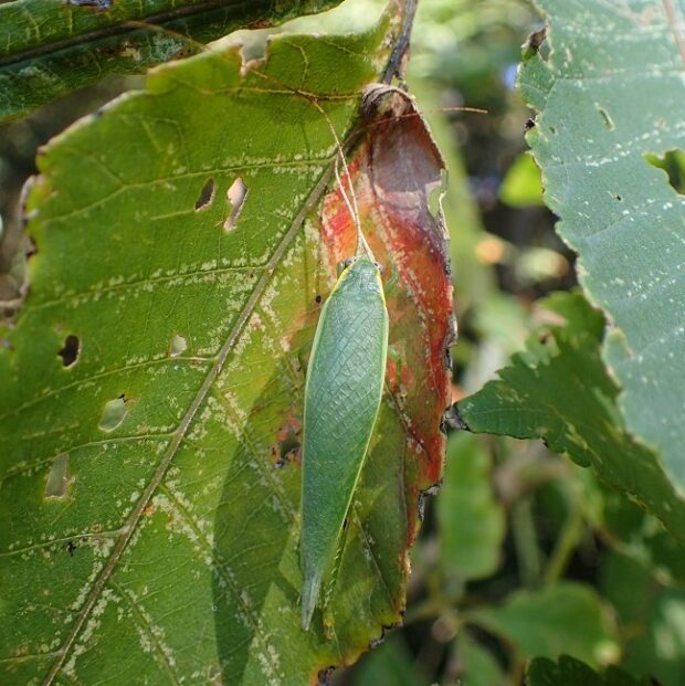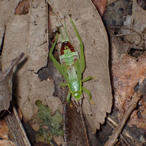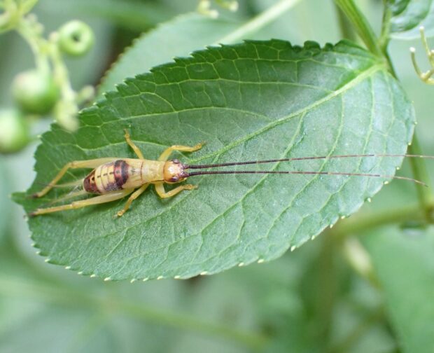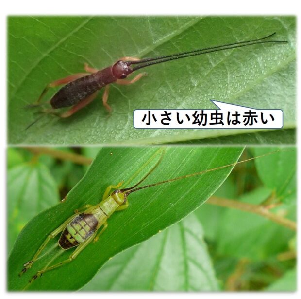 コオロギの仲間。 木の上で、 オスは「リーリーリー」とかん高い声で鳴きます。 明治時代に中国から入ってきた外来種と言われており、 都市部の緑地や街路樹で多く見られます。 緑色をしており、 オスははねの模様が複雑です。