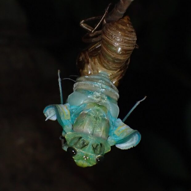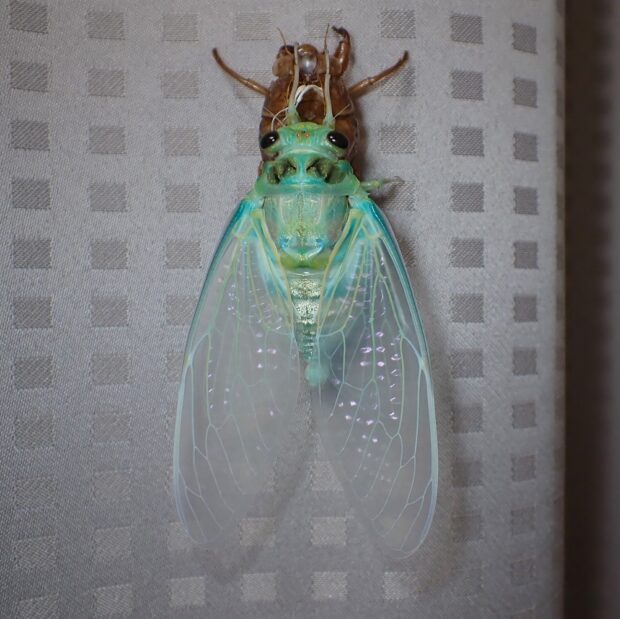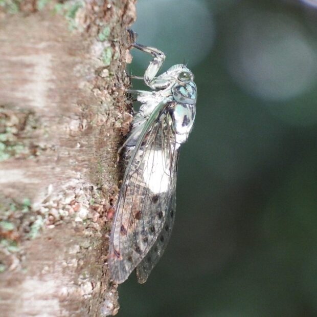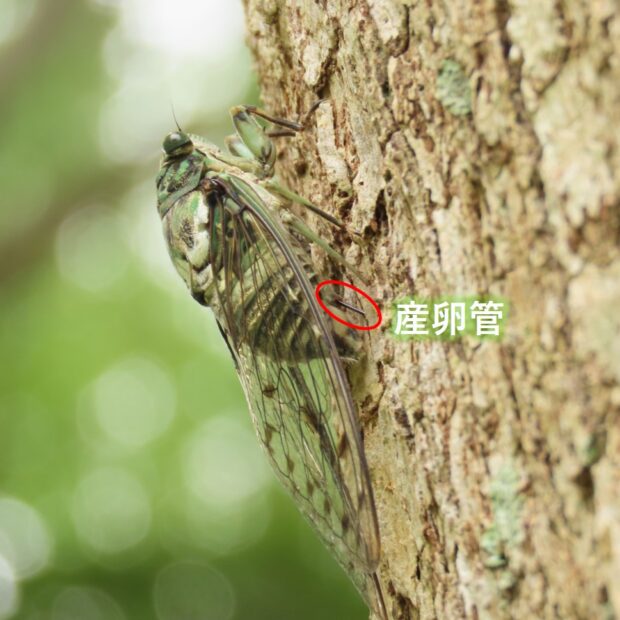 「ミーン・ミンミンミン・・・」と夜明けとともに鳴きはじめ、 夕方まで鳴き続けます。 東日本では都市部の緑地にたくさんいますが、 西日本では平地ではほとんど見られず、 山地で見られます。