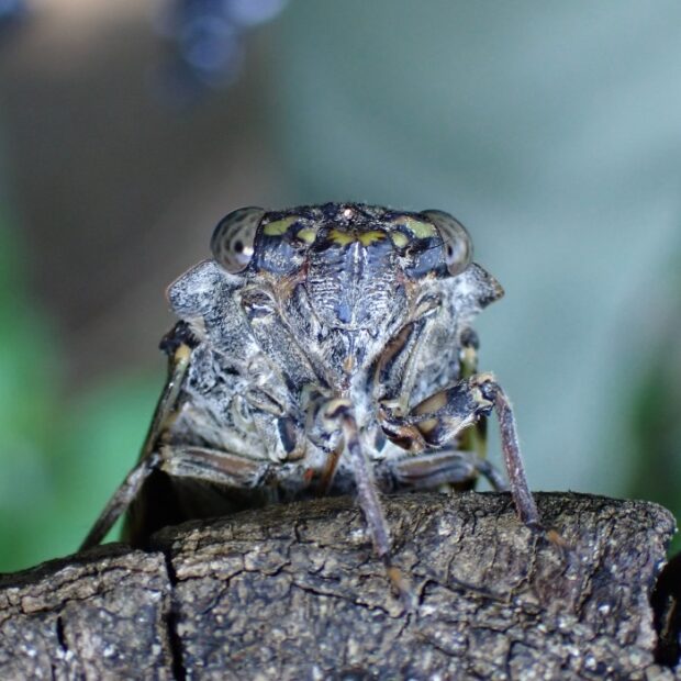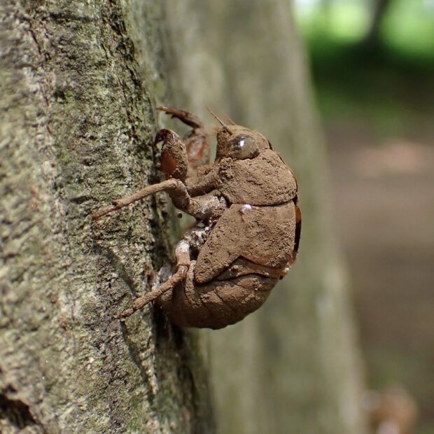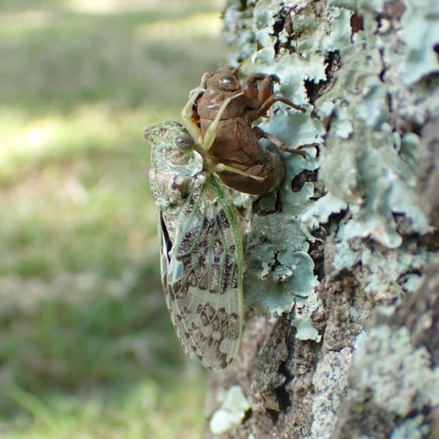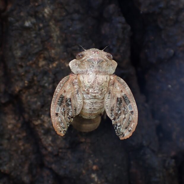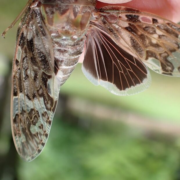 6月下旬ころから「チー・・・ジー・・・♪」と、 早朝から夕方薄暗くなるまで鳴き、 夏の訪れを知らせてくれます。 前ばねは複雑なまだら模様をしており、 木の幹にとけこみ目立ちません。 後ばねは黒地でふちは透明です。
