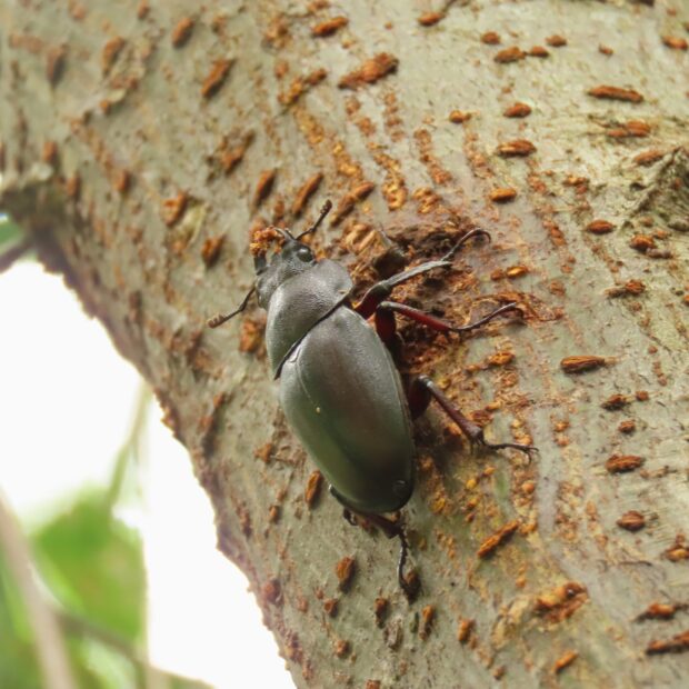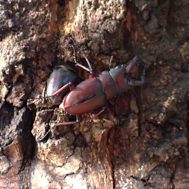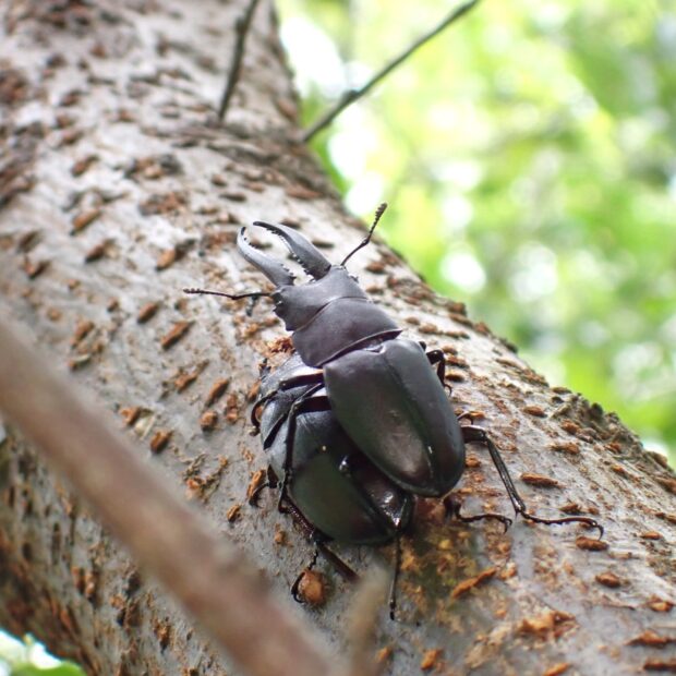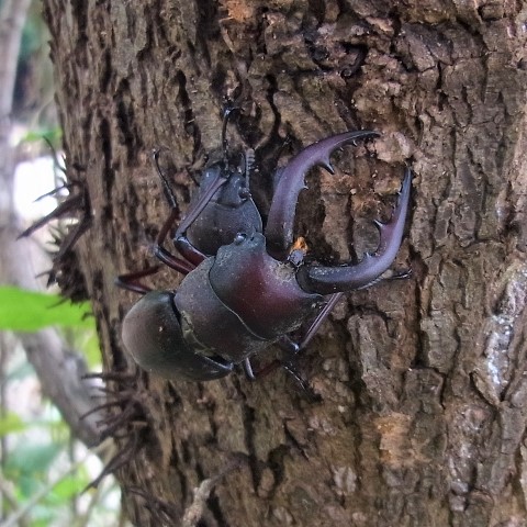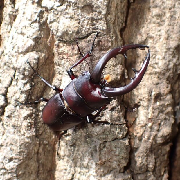 雑木林でお馴染みのクワガタムシ。 完全な夜行性ではなく、 日中でもクヌギやヤナギなどの樹液にやってきます。 オスの大あごの形は体の大きさによって違い、 大型のオスは大きく曲がった大あごを持ち、 小型のオスは短く直線的な大あごを持ちます。