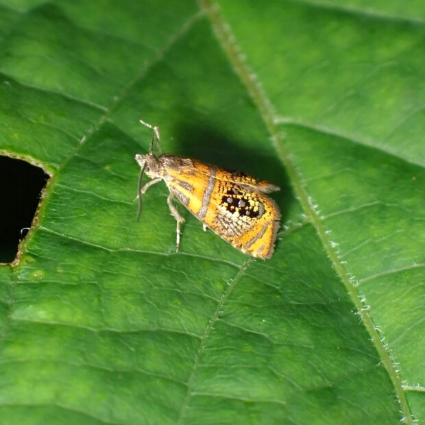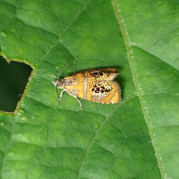 ハマキガ科ヒメハマキガの仲間。 色合いが美しいヒメハマキ。 前ばねは橙黄色で、 銀色のスジや黒と銀色の紋が並んでいます。 夏、 林縁などで見られ、 明かりにやって来ます。