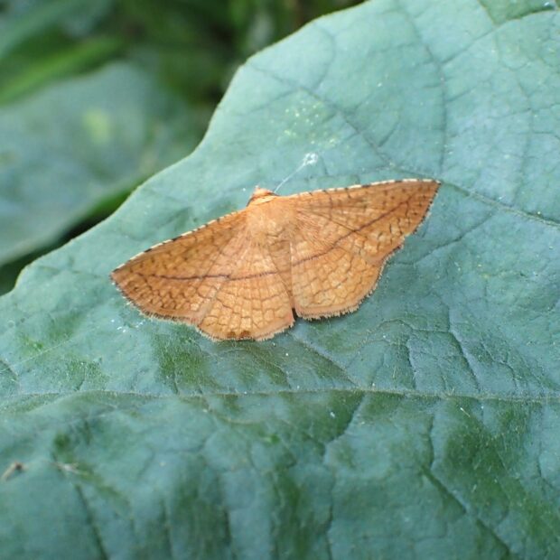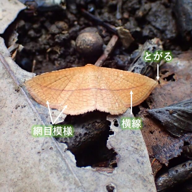 マドガ科の仲間。 網目模様がある橙黄色のはねに、 茶褐色の横線が前ばねから後ばねにかけて走ります。 南の地域ではヒメアカジママドガという似ている種類がいます。