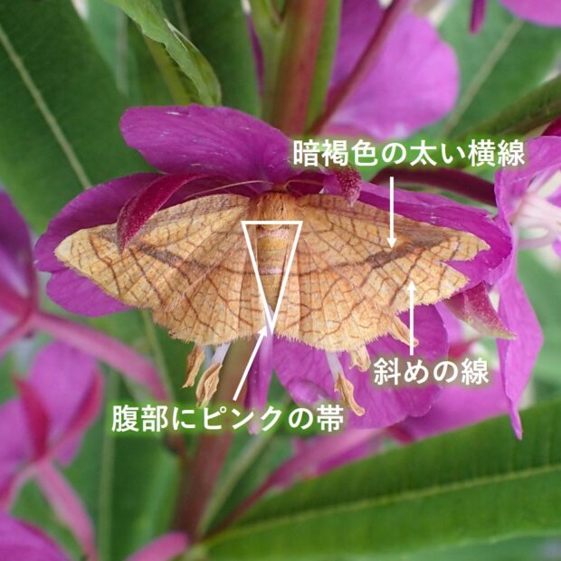 マダラガ科の仲間。 黄橙色のはねに細い線がまだら状にあります。 前ばねから後ばねにかけて走る暗褐色の太い帯が目立ち、 そこから斜めに伸びる線があります。 明かりに飛来。